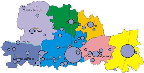 Najwięcej zdarzeń było w mieście Łęczyca – 45, w Piątku było ich 30, rozkład wszystkich zdarzeń można zobaczyć na rysunku poniżej.