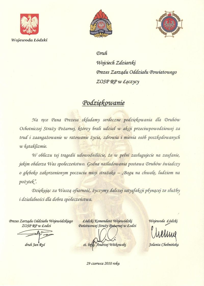 We wtorek tj. 29 czerwca 2010 r. na dziedzińcu Zamku Królewskiego w Łęczycy odbyło się uroczyste wręczenia podziękowań dla służb i jednostek Ochotniczej Straży Pożarnej z powiatów, które dla brały udział w walce z powodzią w maju i czerwcu tego roku.